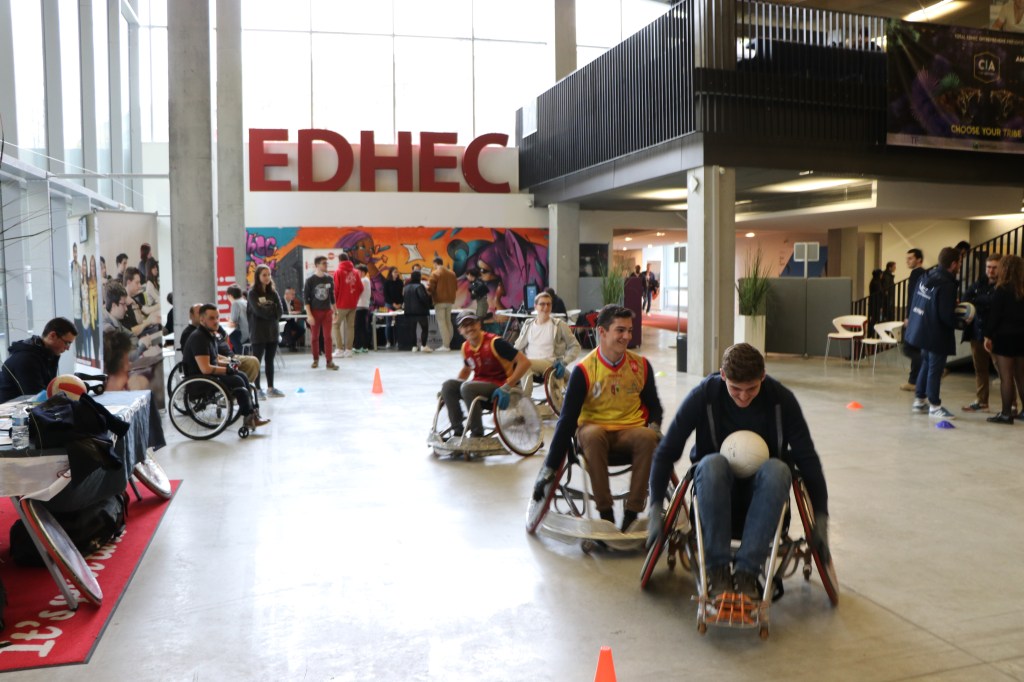 Les étudiants de l’EDHEC étaient invités à participer à des matchs de rugby et de hockey en fauteuil roulant, mais aussi défier leurs sens à travers un blind test culinaire,  ou encore un parcours à l’aveugle… Ils ont également pu tester des casques de réalité virtuelle, et approfondir leur connaissance du handicap en participant des quiz.
